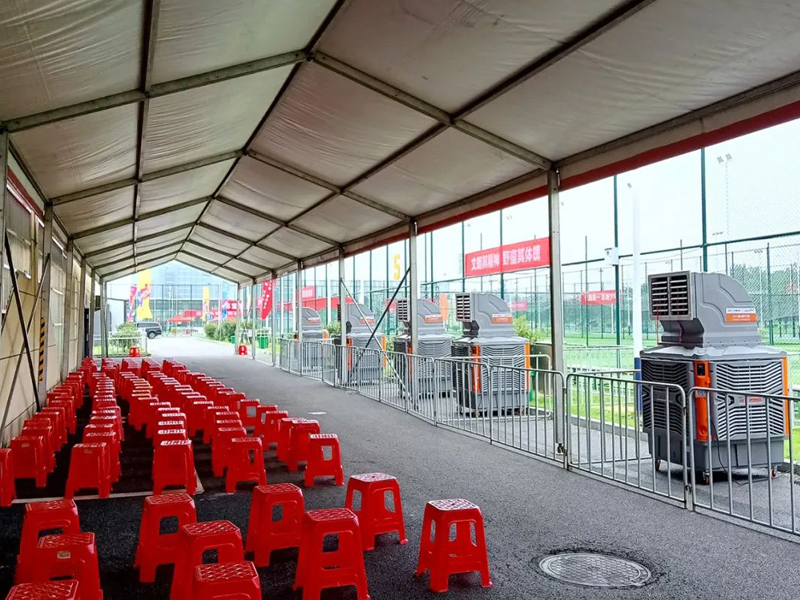 本次活動期間,瑞泰風經過現場實地考察,科學規劃,一次性投放了30套移動冷風機設備,其中包括經典版和體育版兩個系列產品,降溫效果顯著,安裝使用也非常便捷,確保各項室內、戶外賽事活動的順利開展。移動冷風機是一款節能環保的降溫設備,尤其適合戶外使用,僅需2分鐘即可將35℃的高溫降低到26~27℃,達到人體最舒適,也是多類體育項目最適宜的溫度環境。此外,移動冷風機送風距離遠,覆蓋范圍廣,單臺設備的送風距離可達30米,并且有效覆蓋120°扇形區域。