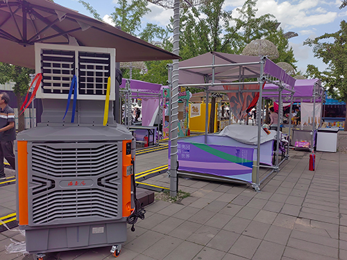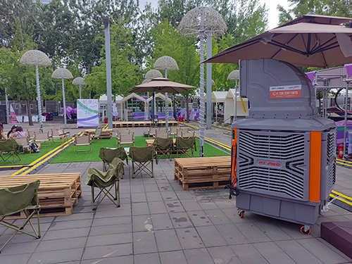 2.在降溫原理上,設(shè)備堅守環(huán)保初心,采用水循環(huán)蒸發(fā)吸熱技術(shù),通過自然物理過程降低空氣溫度,全程無需氟利昂等制冷劑,從根源上避免傳統(tǒng)空調(diào)的溫室氣體排放,完美契合戶外餐飲的綠色發(fā)展需求。300L大容量水箱搭配便捷加水口,一次加水即可連續(xù)運行一整天,輕松覆蓋整晚營業(yè)時段;若搭配專用冰晶盒使用,冷風(fēng)溫度可進(jìn)一步降低,持續(xù)為場地輸送沁爽涼意。